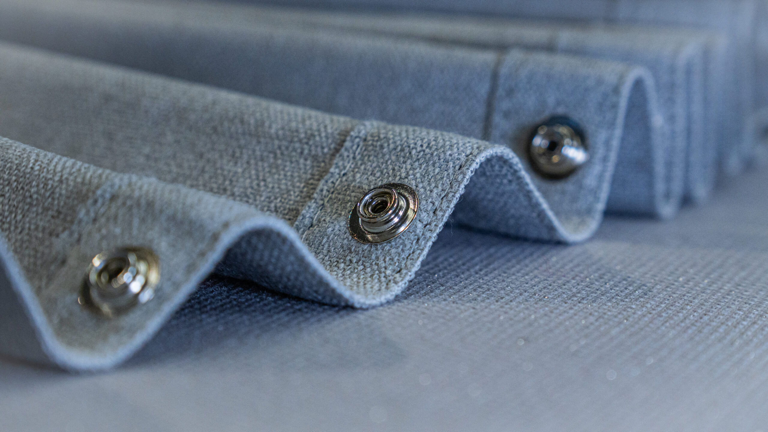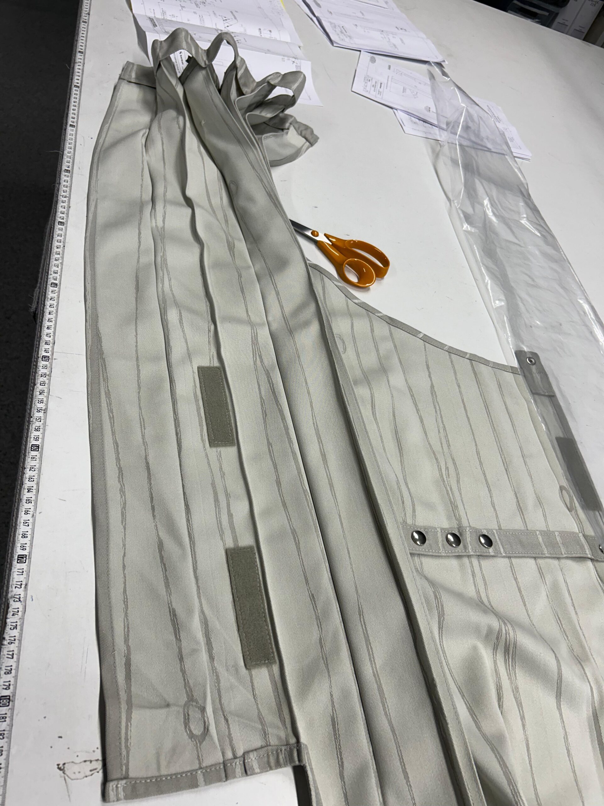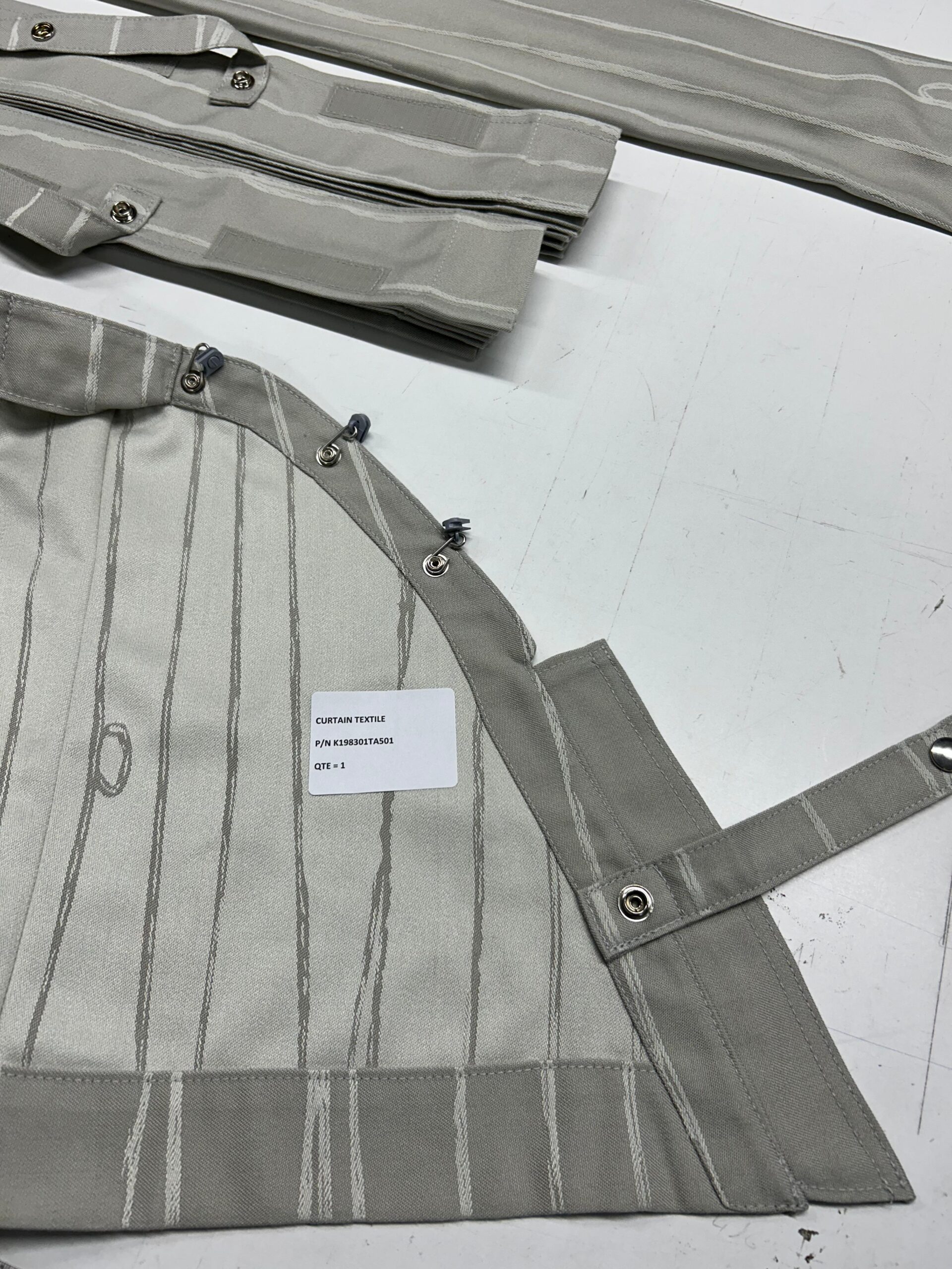 Confection de rideaux (rideaux cabine, rideaux séparateurs de classe, rideaux d’isolation) établie après des plans et/ou prise de mesures sur avion.